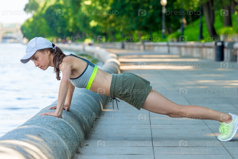 Отжимания на городской набережной, активная женщина со спортивной фигурой во время разминки