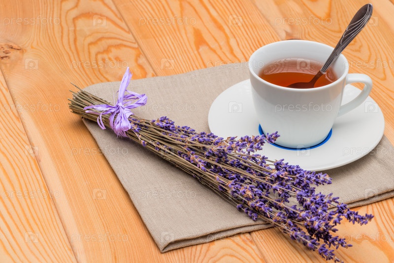 Горячий чай в чашке с лавандой на льняной салфетке крупным планом
