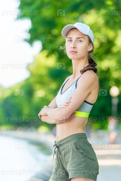 На городской набережной вертикальный портрет крупным планом спортивной девушки, которая позирует