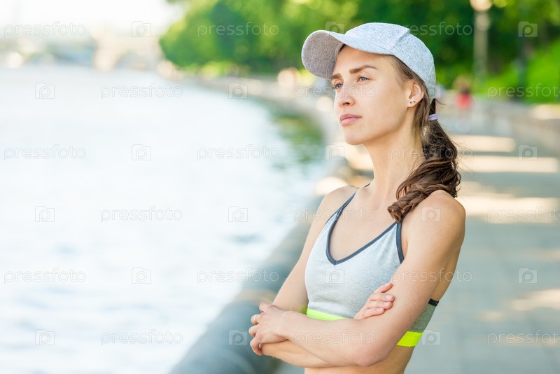 Вертикальный портрет мечтательной спортсменки, позирующей на набережной