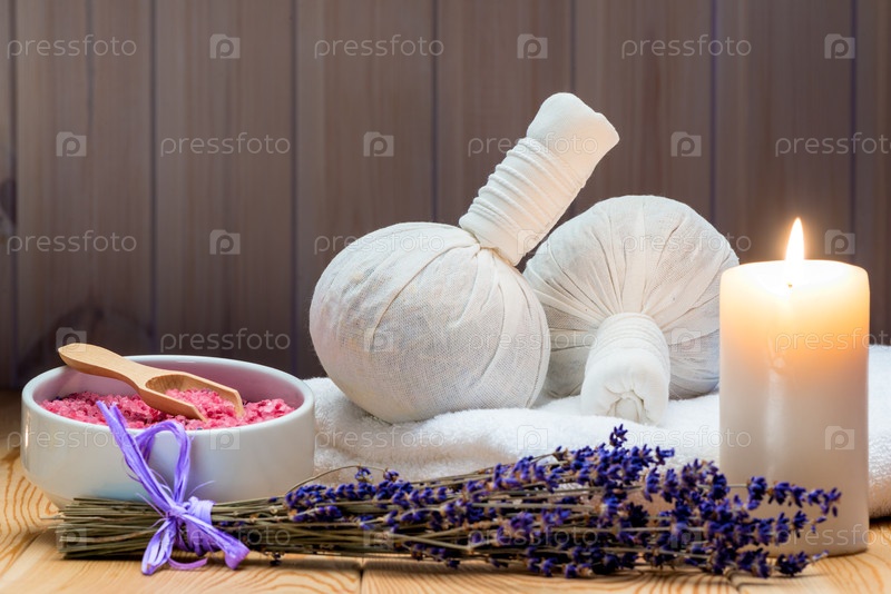Травяные сумки с натуральной лавандой и морской солью с горящей свечой для спа, релаксации и романтической атмосферы