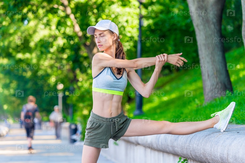 Стройная женщина-спортсмен разогревается перед пробежкой в городском парке, портрет на набережной