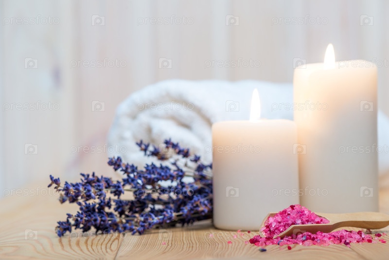 Крупный план морской соли с лавандой и горящими свечами спа-процедуры