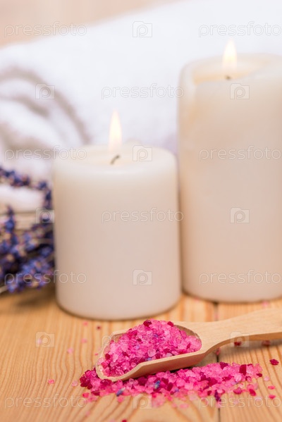 Закрыть морскую соль в деревянной ложке и горящие свечи, успокаивающие спа-процедуры с лавандой
