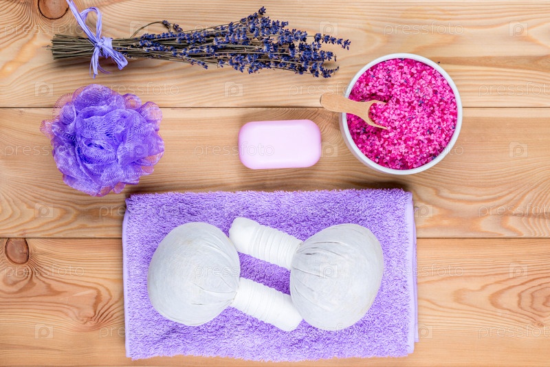 Вид сверху травяные сумки с натуральной лавандой для массажа, морская соль для релаксации и массажа и спа
