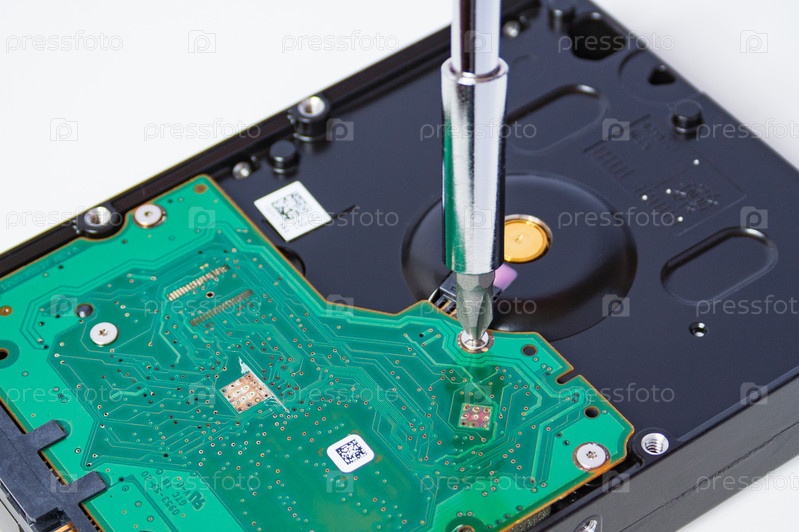 Вид крупным планом использования отвертки для открытия винтов на жестком диске. Ремонт компьютера