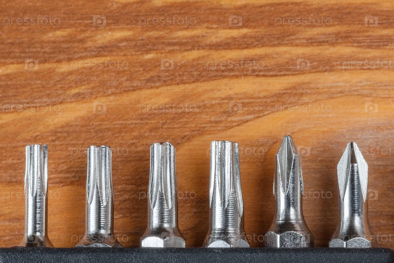 Набор головок для отвертки (битов) на деревянном столе с копировальным пространством (плоская укладка)