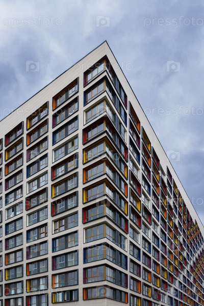 Угол современного здания из бетона с цветными вставками на окнах на фоне облачного неба