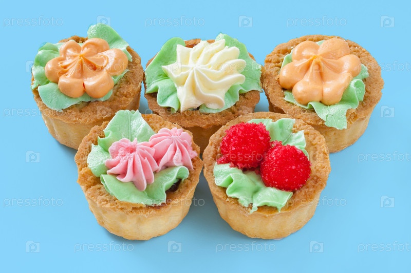 Пять пирожных со сливками сверху, в форме цветов и ягод, на светлом бирюзовом фоне