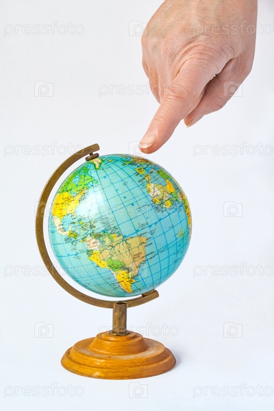 Женская рука указывает на глобус. Концепция выбора места для отдыха или путешествия