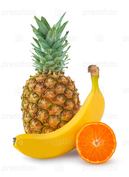 Свежие тропические фрукты. Ананас, банан, мандарин с выделенными на белом фоне тенями