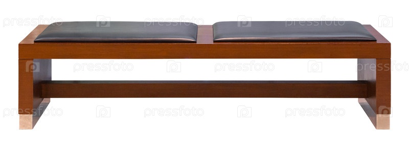 Коричневая деревянная скамейка с двумя мягкими кожаными сиденьями, изолированными на белом фоне