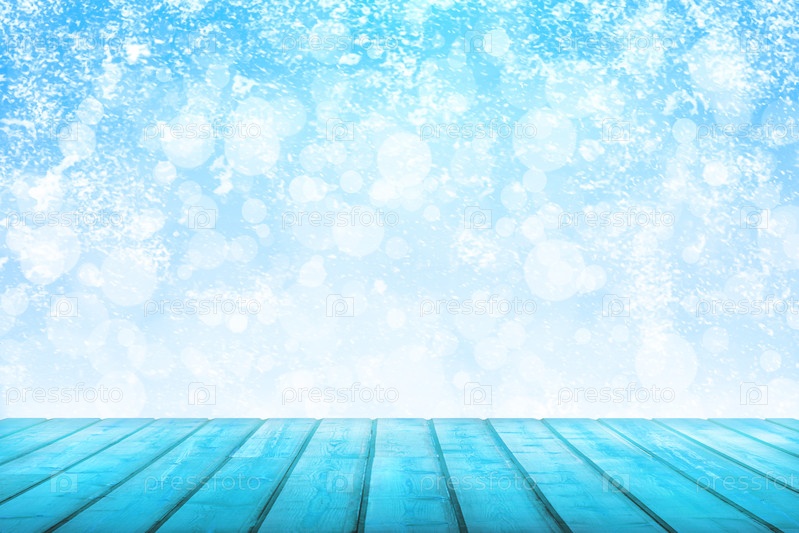 Перспективный вид на бирюзовые деревянные доски на фоне абстрактного зимнего снегопада в боке (концепция, копия пространства)