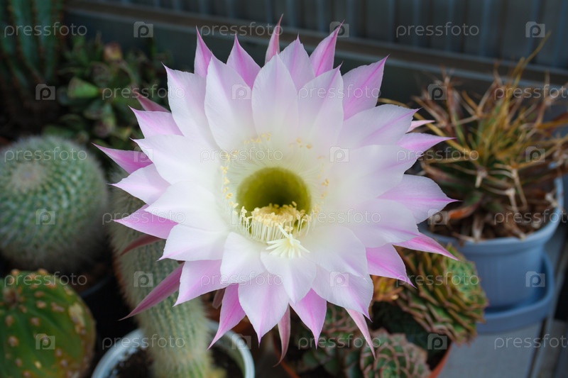 Вид на большой бело-розовый цветок кактуса echinopsis