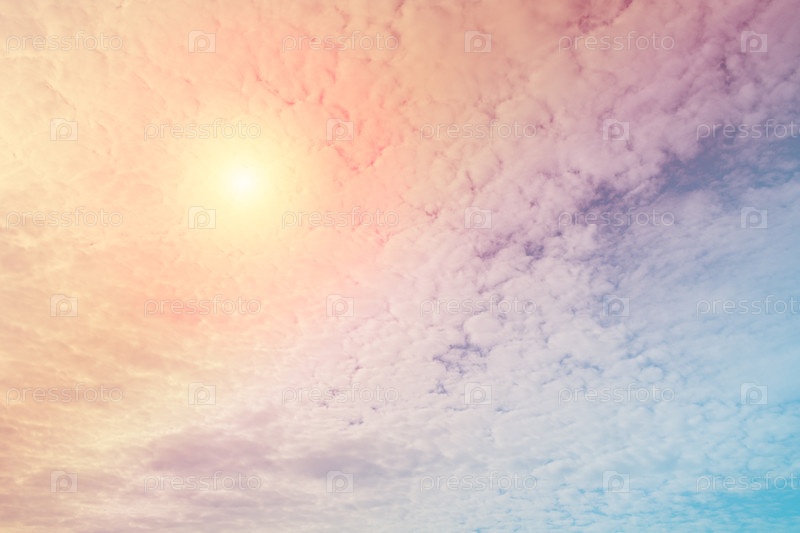 Абстрактный вид на фантастические мягкие облака с пастельным цветом и солнцем в небе как фон