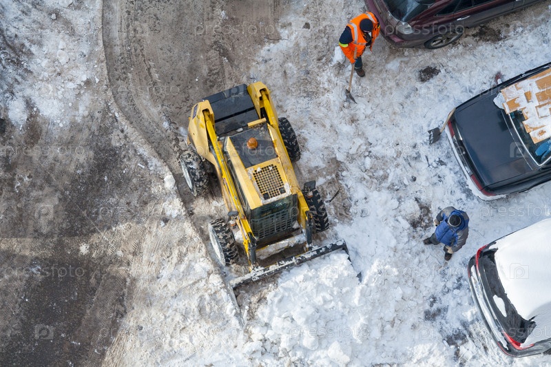 Вид сверху на снегоуборочную машину, очищающую дорогу, и рабочего в оранжевой форме