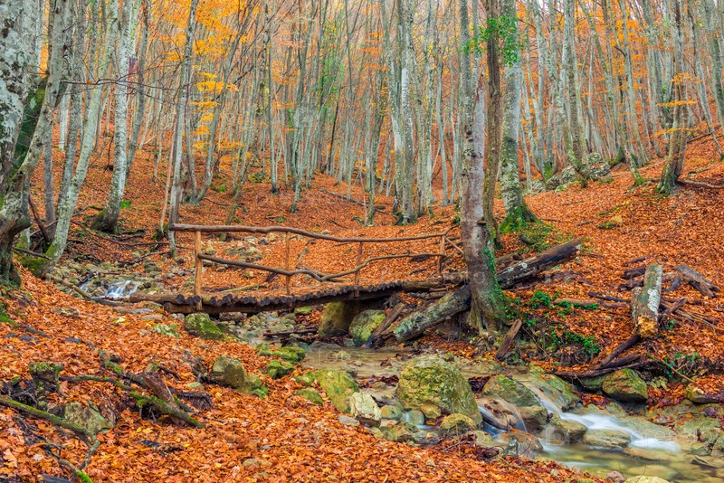 Осень, горы красивый пейзаж - деревянный мост через реку в ущелье