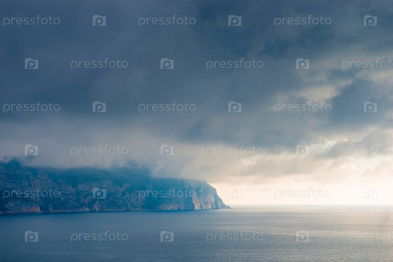 Облака, море и скалистый берег красивый живописный пейзаж с драматическим небом