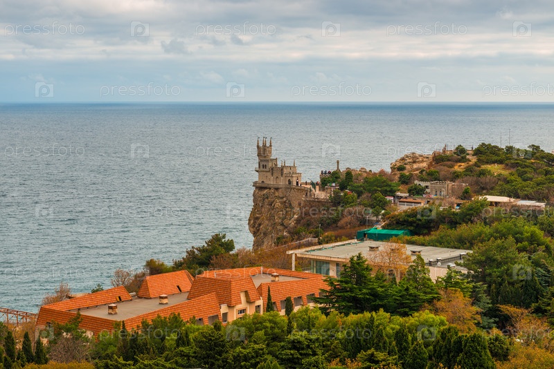Туристический объект Крыма Россия - Ласточка Гнездо на краю обрыва на фоне моря
