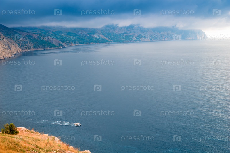 Пейзажный морской пехотинец, небольшая лодка выходит в море, погода перед бурей