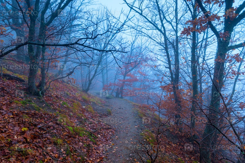 Путь в темном туманном лесу в горах, осенний пейзаж