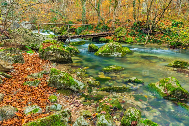 Подлинный деревянный мост через горную реку, красивый осенний пейзаж