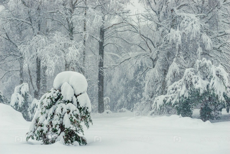 Капсы снега на ветвях деревьев и ели в зимнем лесу