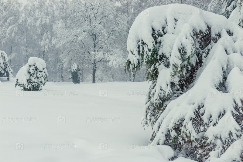 Снег дрейфует на ветвях деревьев и ели в зимнем лесу