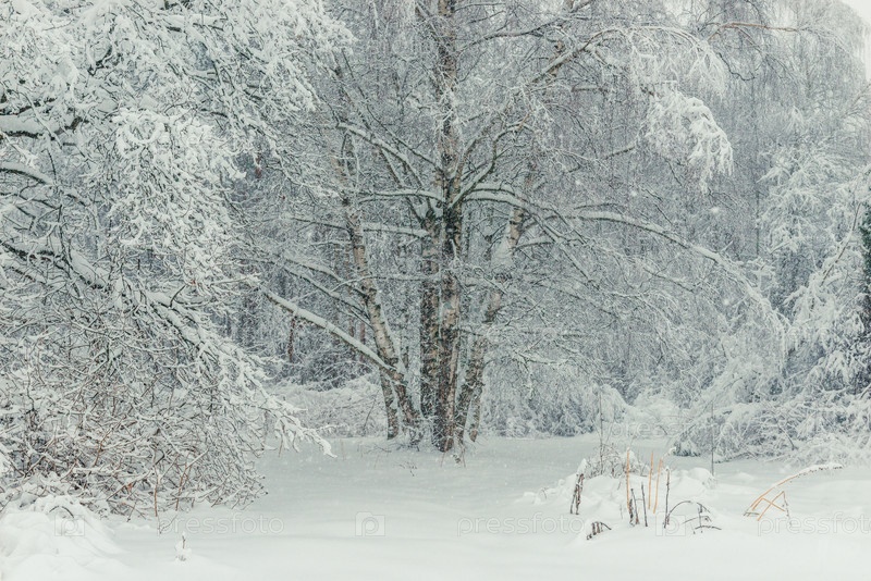 Заснеженная ландшафтная группа берез в лесу, фото зимой