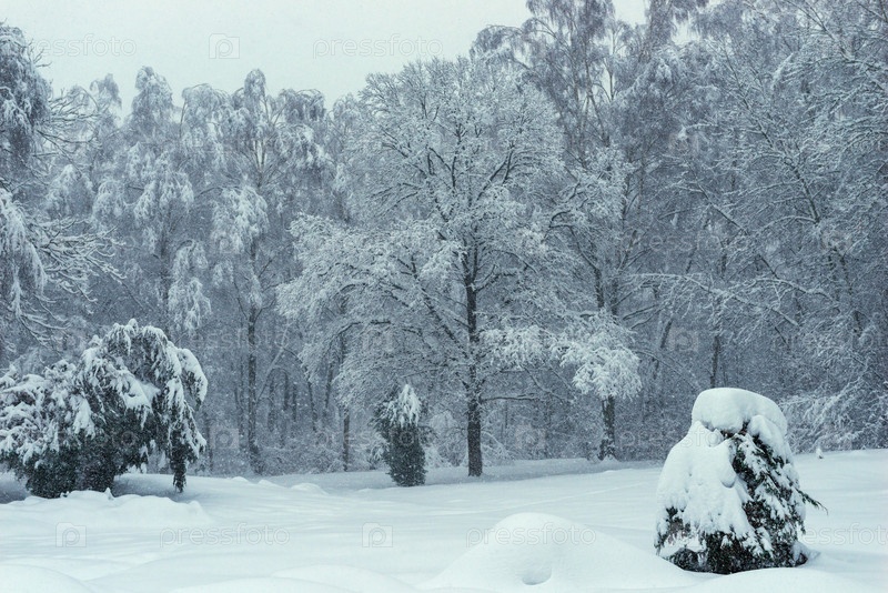 Снежная зимняя погода в парке, сугробы и деревья - прекрасный зимний пейзаж