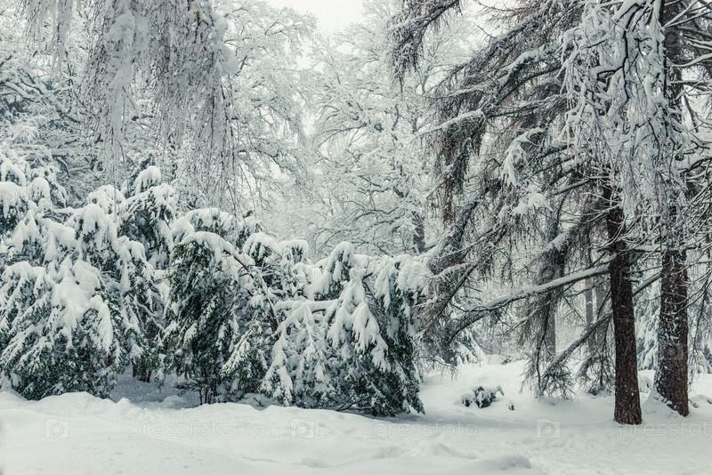 Пейзаж в зимнем лесу - еловые деревья с тяжелыми ветвями, покрытые снегом