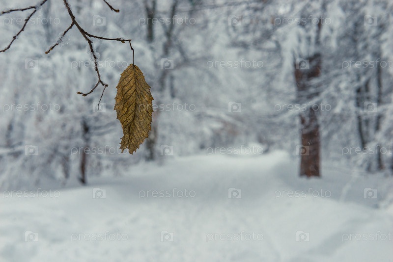 Одинокий сухой лист в тумане на фоне заснеженного леса