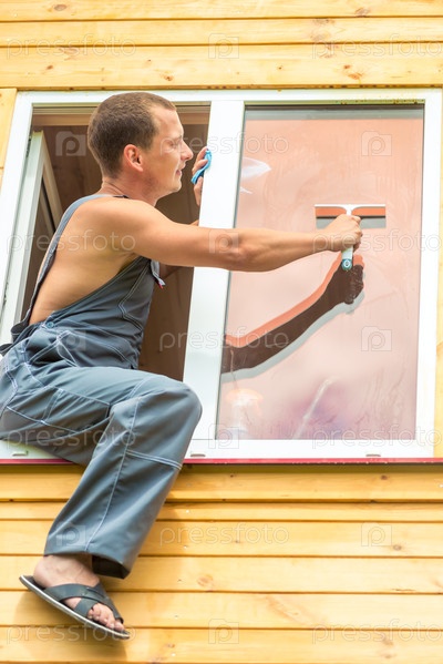 Мужчина-профессионал в комбинезоне убирает окно в доме
