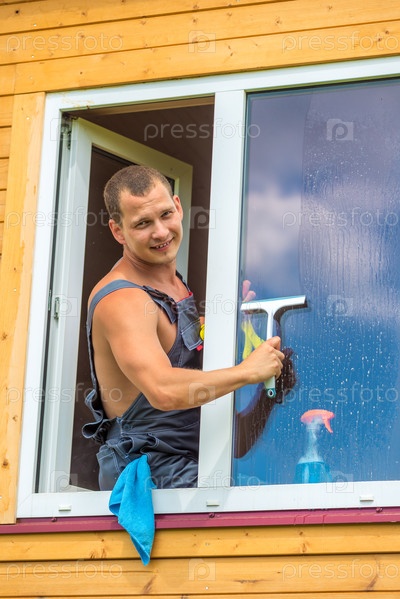 Портрет мужчины в комбинезоне с инструментами промывает окно в доме