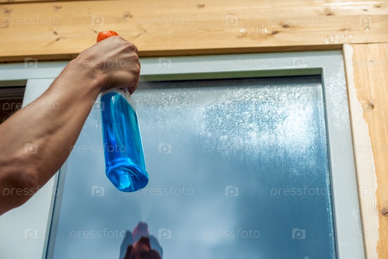 Стиральное окно, крупный план очистителя спрея в мужской руке на оконном фоне