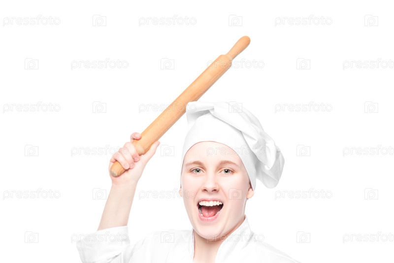Сумасшедший повар с качающимися булавками на белом фоне, портрет изолированный