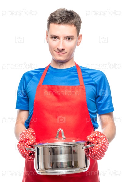 Повар-мужчина в фартуке с кастрюлей в руках, портрет на белом фоне