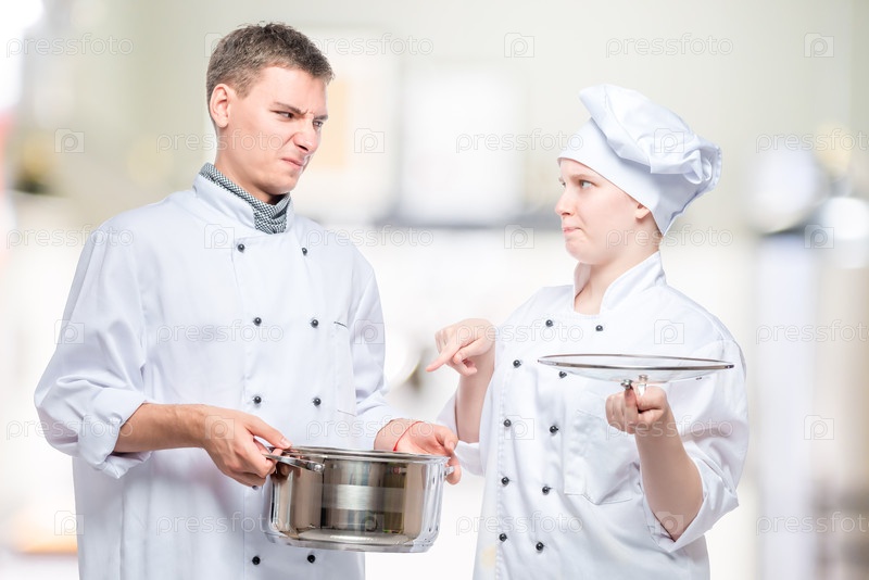 Шеф-повар смотрит на приготовленное блюдо молодого повара с упреком на кухне