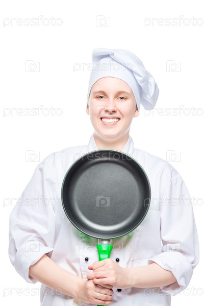Портрет изолированного шеф-повара с сковородкой на белом фоне