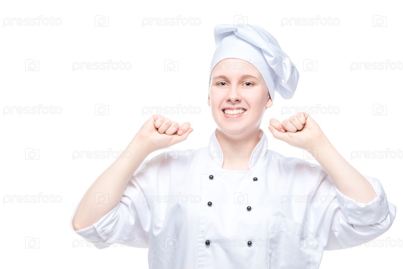 Успешный шеф-повар в костюме радуется победе, эмоциональный портрет на белом фоне