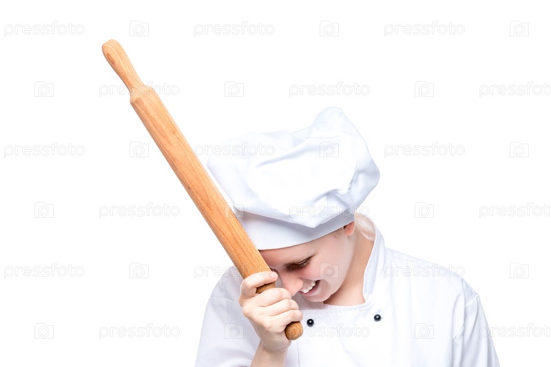 Смеющийся веселый шеф-повар с булавкой, позирующей на белом фоне, портрет изолированный