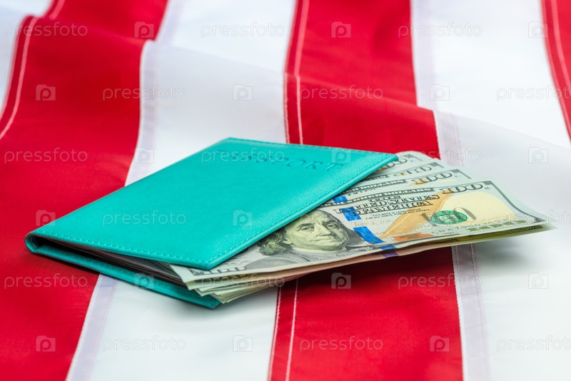 Паспорт, набитый долларами США на крупный план флага США