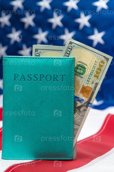 100 долларовых купюр в паспорте на фоне американского флага крупным планом