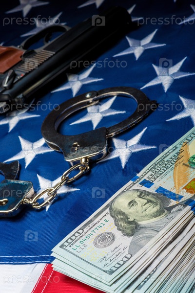 Концепция фотопреступления и наказания сняла деньги и оружие на американском флаге