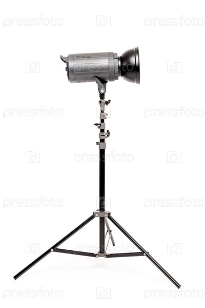 Боковой вид мощной фотовспышки на стойке на белом фоне в студии