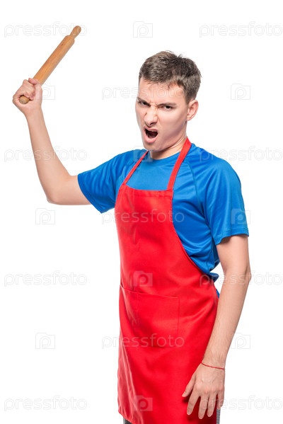 Разгневанный мужчина в фартуке с булавкой, портрет изолирован на белом фоне