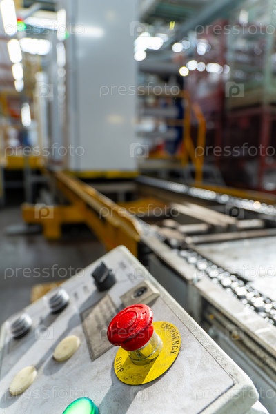 Аварийная остановка установлена на конвейере в заводе по производству холодильников Кнопка START - STOP для промышленного оборудования Промышленная и заводская концепция