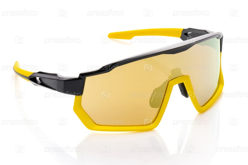 Современные стильные желтые спортивные очки, предназначенные для активного отдыха и защиты. Современные стильные желтые спортивные велосипедные очки с зеркальными линзами. Полная глубина зрения