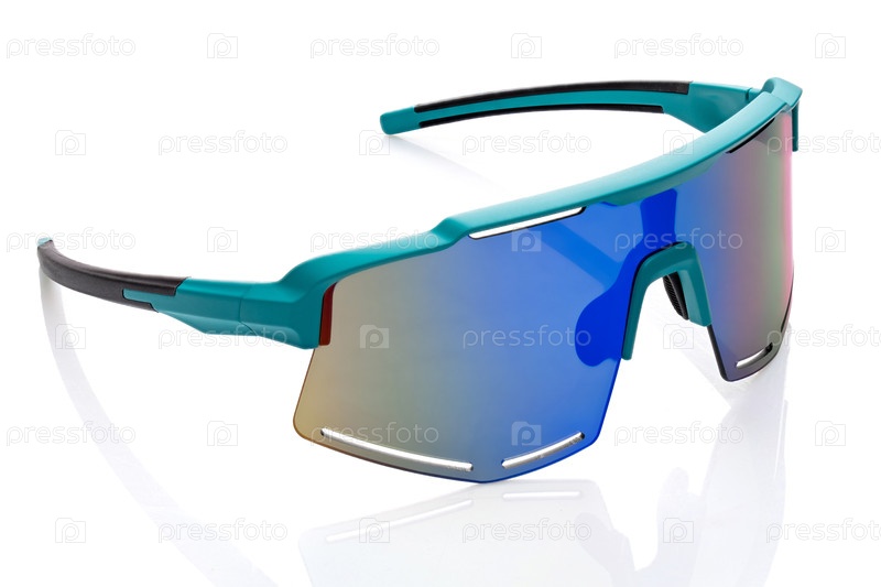 Современные стильные зеленые спортивные очки, предназначенные для активного отдыха и защиты. Современные стильные зеленые спортивные велосипедные солнцезащитные очки с синими зеркальными линзами. Полная глубина зрения