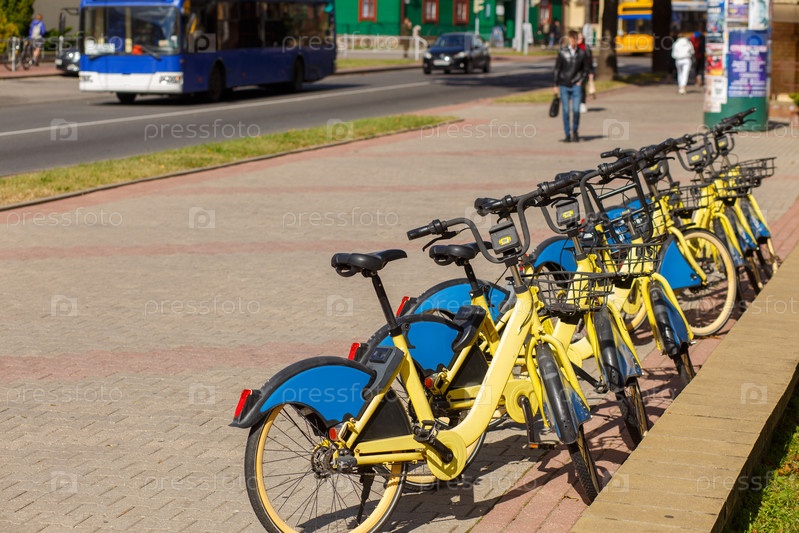 Группа велосипедов с корзинами на парковке улицы в Гродно, Беларусь
